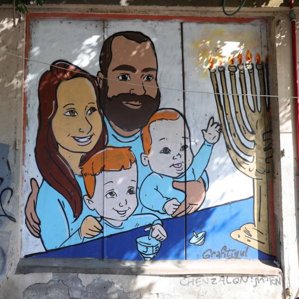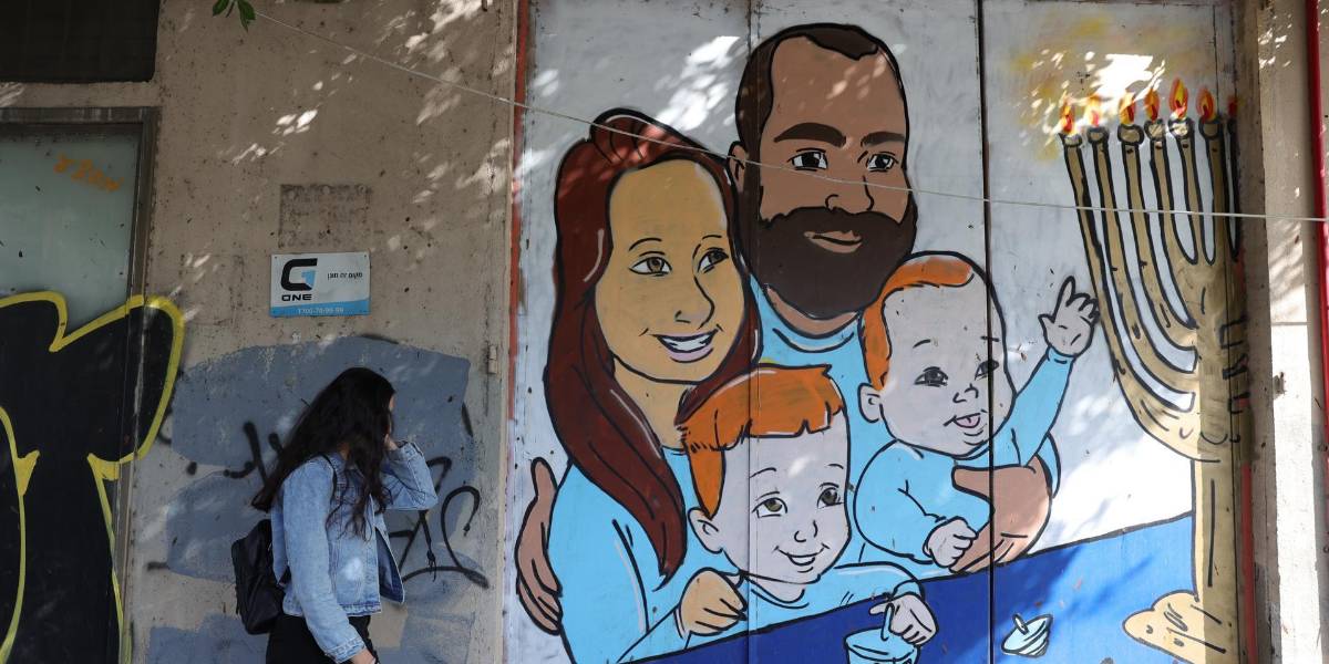 Una mujer pasa junto a un grafiti de la familia Bibas en Tel Aviv, Israel, el 20 de febrero de 2025.( )