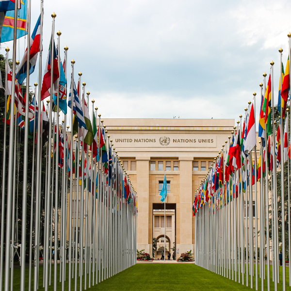 Foto del edificio de las Naciones Unidas con las banderas de todos los países( )