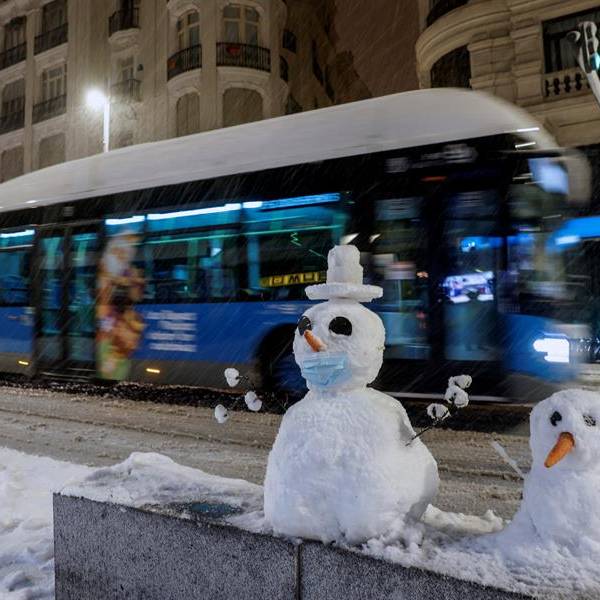 Dos muñecos de nieve en la Gran Vía, en Madrid. Foto: EFE.