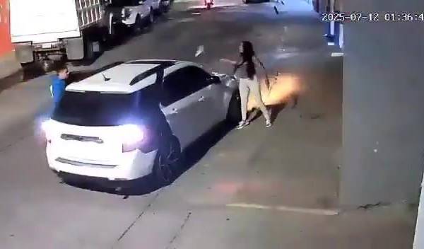 La mujer ignora los disparos y se acerca nuevamente al agresor, quien le dispara en varias ocasiones, provocando que ella caiga al suelo. Luego, el hombre guarda el arma en el interior del vehículo y se retira del lugar.