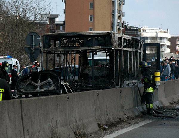 Un hombre prendió fuego a un bus escolar en Italia. Foto: AP