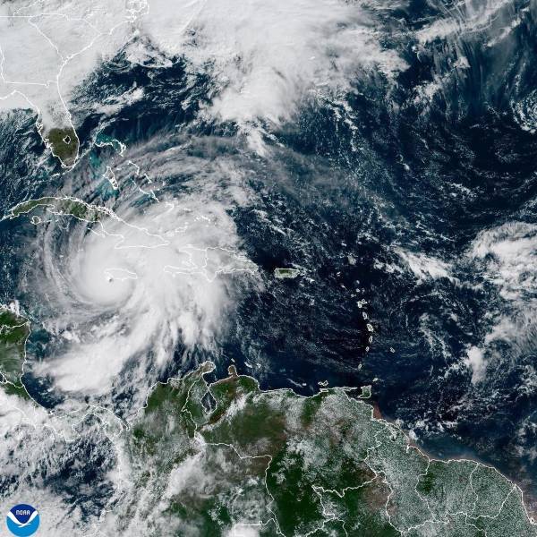 Fotografía satelital cedida este martes por la Oficina Nacional de Administración Oceánica y Atmosférica de Estados Unidos (NOAA), a través del Centro Nacional de Huracanes (NHC), donde se muestra la localización del huracán Melissa en el mar del Caribe. ( )