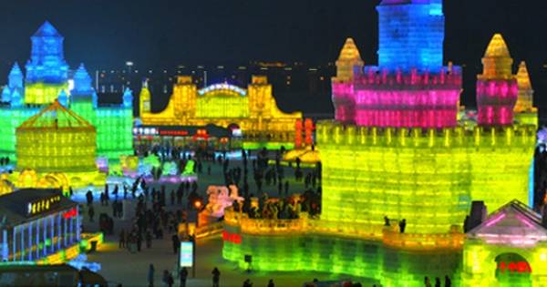 La edición número 31 del evento parece la más impresionante de todas: la exhibición central presenta castillos y edificios famosos, cuyos bloques helados son iluminados por la noche.