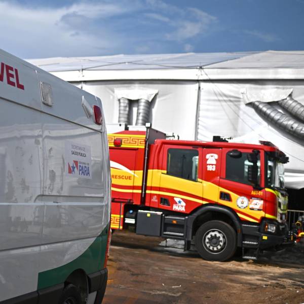 Fotografía que muestra vehículos de emergencia tras un incendio en el Centro de Convenciones Hangar donde se realiza la COP30 este jueves, en Belém (Brasil). EFE/ Andre Borges( )