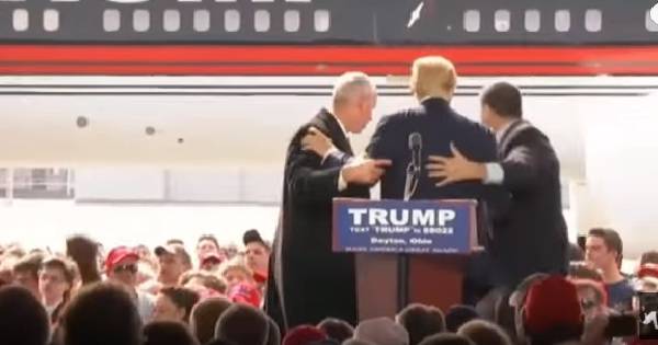 Trump estaba dando su discurso cuando agentes de seguridad corrieron a protegerlo de un activista que saltó la valla de seguridad y corrió a la parte trasera del escenario para, supuestamente, lanzarle algo por la espalda al magnate.