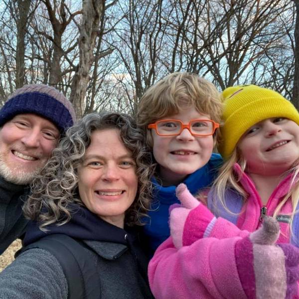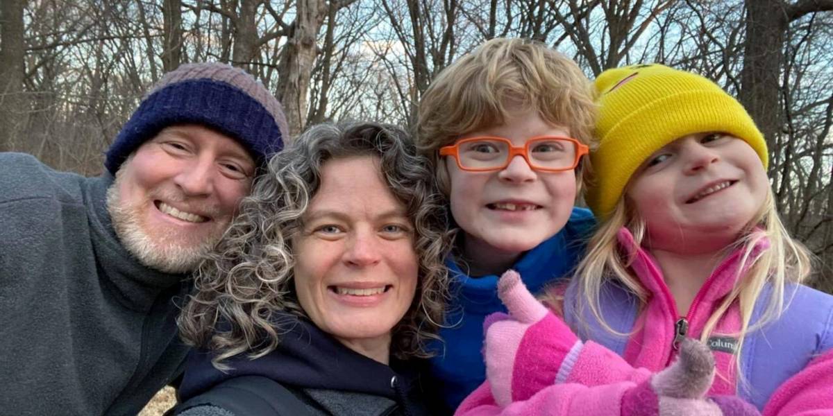 En una imagen de 2022 proporcionada por las familias Schmidt y Morehead se muestra de izquierda a derecha, a Tyler Schmidt, su esposa Sarah, su hijo Arlo y su hija Lula durante una excursión cerca de Cedar Falls, Iowa.( )