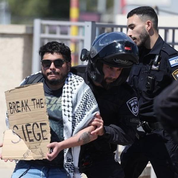 Con un cartel pintado sobre cartón que decía "Rompan el cerco. Palestina libre", la veintena de protestantes proclamaron consignas en hebreo en contra de la guerra en Gaza, antes de ser detenidos a empujones por el Ejército que se ha llevado contenidos y esposados a cinco de los israelíes.