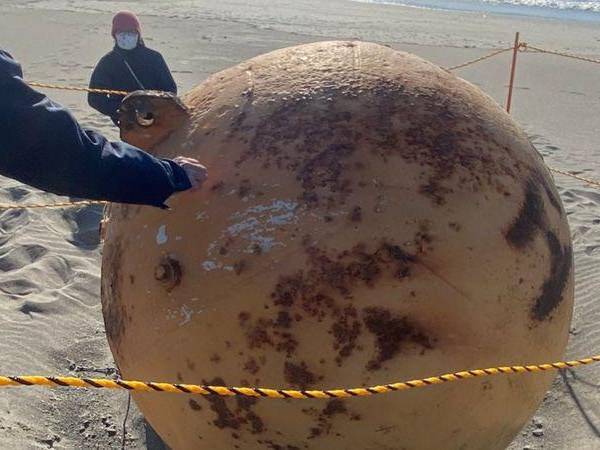 La televisión pública japonesa NHK mostró imágenes de dos funcionarios en la playa de Enshuhama observando la esfera de metal oxidada, cuyo diámetro aproximado es de 1,5 metros.