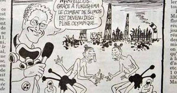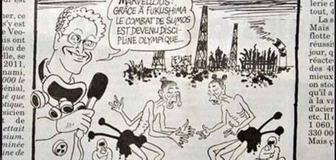 Una de las viñetas del semanario de humor gráfico francés muestra dos luchadores de sumo (uno de ellos con tres brazos y otro con tres piernas) muy desmejorados y delgados, y a dos jueces enfundados en trajes antiradiación mientras un locutor dice: "Gracias a Fukushima el sumo se ha convertido en disciplina olímpica".