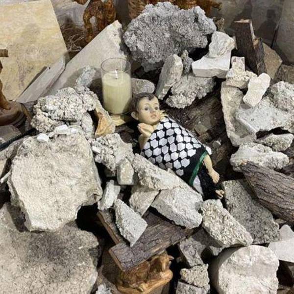 Un pesebre hecho de escombros, en el que yace un niño Jesús arropado por una kufiya palestina, recibe a los feligreses de una de las iglesias en Belén.