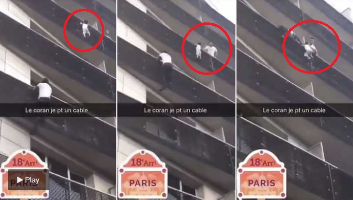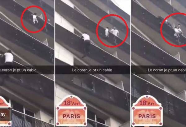 El suceso, espectacular, grabado y difundido por las redes sociales, muestra a un joven escalar a mano limpia y en treinta segundos cuatro balcones de la fachada de un edificio para llegar al cuarto piso, recuperar al niño suspendido y ponerlo en seguridad.
