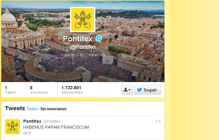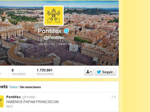 La cuenta de twitter @pontifex, con la que el papa emérito Benedicto XVI desembarcó en la esta red social y que había quedado desactivada temporalmente, tras su renuncia, vuelve a estar operativa y su primer tuit ha sido: "Habemus Papam Franciscum". Este primer tuit ha sido escrito alrededor de las 20.30 horas local (19.30 GMT) después de que el recién elegido pontífice, el cardenal argentino Jorge Mario Bergoglio, que ha escogido el nombre de Francisco, hiciera su primera aparición ante los fieles que llenaban la plaza de San Pedro del Vaticano.