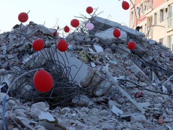 Voluntarios en Turquía han atado globos rojos, azules y rosados sobre los escombros de las edificaciones destruidas para recordar a los niños y niñas víctimas de los recientes terremotos.