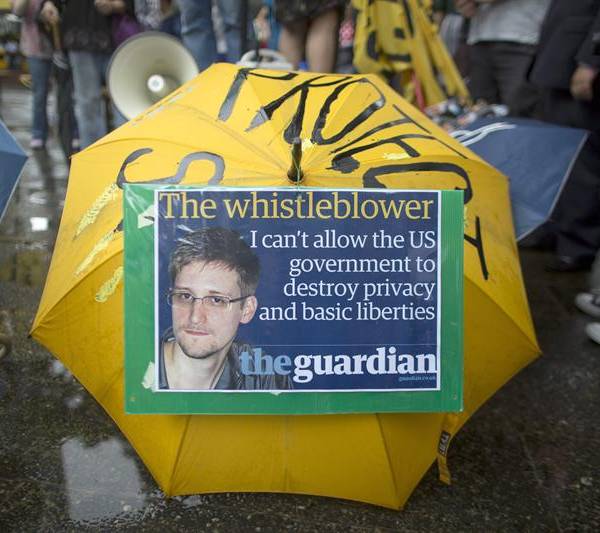 HONG KONG, China.- Un cartel de Edward Snowden sobre un paraguas como símbolo de apoyo al excolaborador de la NSA. Foto: EFE.