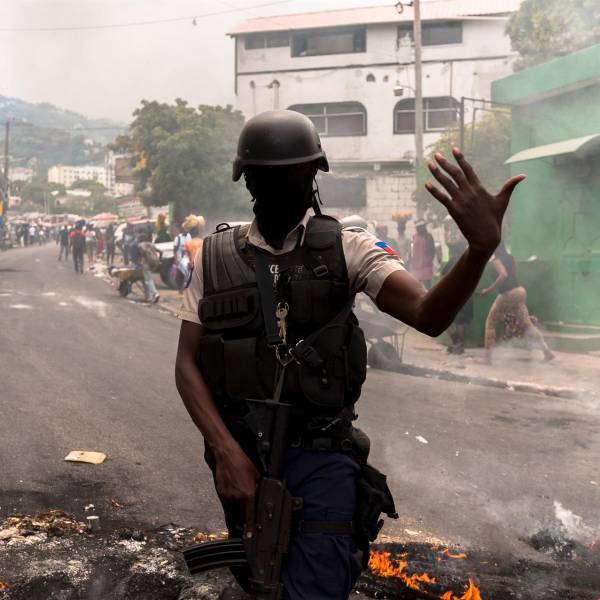 Un policía da indicaciones junto a una barricada en llamas durante una jornada de protesta en Haití.( )