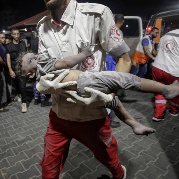 Un miembro de la Media Luna Roja Palestina lleva a un niño herido en la ciudad de Gaza, el 9 de octubre de 2023. ( )