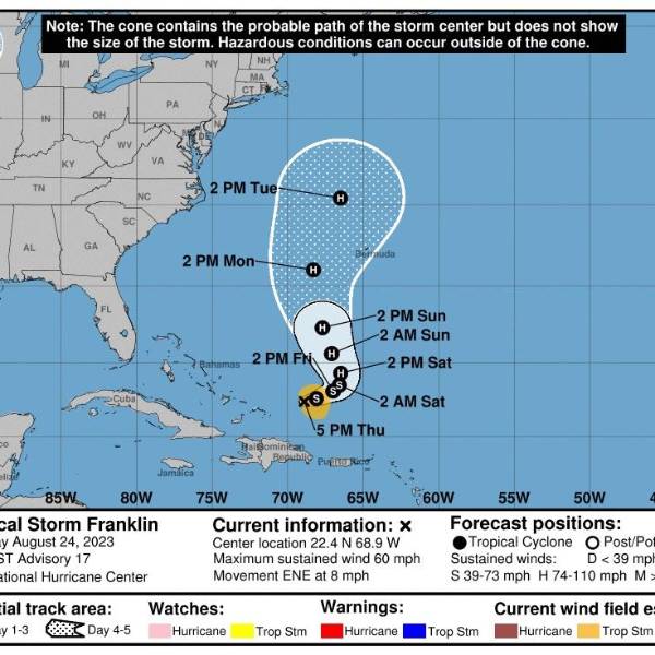 Esta semana, Franklin entró en República Dominicana desde el sur y cruzó la isla Española con vientos y lluvias que generaron inundaciones, para emerger sobre el mar el pasado miércoles. De acuerdo con el gráfico de trayectoria de cinco días mostrado hoy por el NHC, Franklin podría convertirse en un "huracán mayor" (a partir de la categoría 3, con vientos de entre 210-250 km/h, según la escala de huracanes de Saffir-Simpson).
