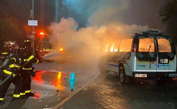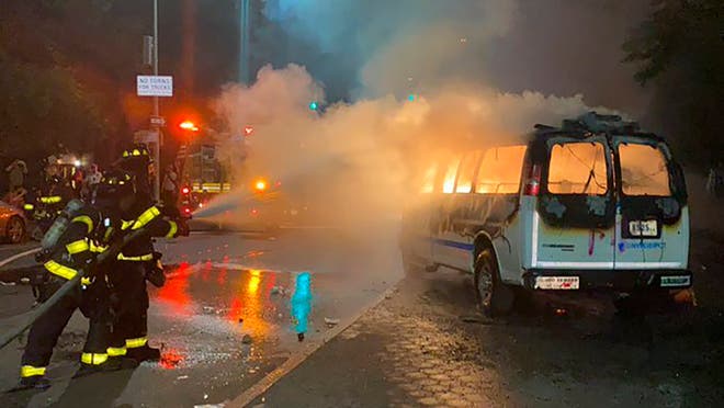Una mujer lanzó una bomba molotov al interior de un vehículo de la policía ocupado por cuatro agentes en Nueva York, durante una manifestación en protesta por la muerte de George Floyd, un estadounidense negro muerto a manos de uniformados, dijo el sábado a AFP la policía neoyorquina.