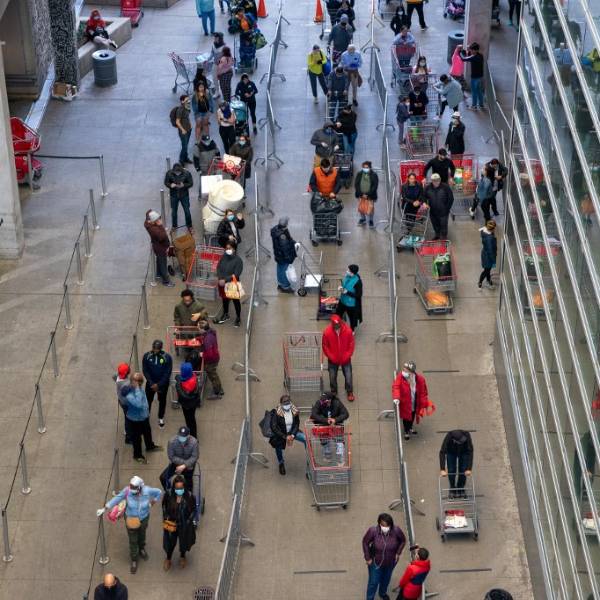 Personas hacen varias columnas para entrar a un almacén en Nueva York. Foto: AFP