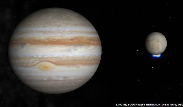 Imágenes captadas por el telescopio espacial Hubble muestran lo que parecen ser chorros de vapor de agua que surgen a través de la corteza de Europa, un signo de que en la luna podrían estar dadas las condiciones para la existencia de pequeños organismos.