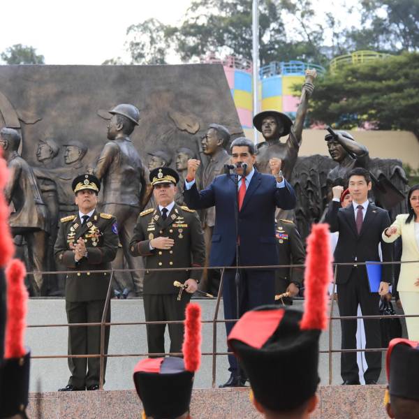 "Hoy el imperialismo lanza una embestida nueva, no es la primera ni la última, solo otra embestida, y Venezuela está de pie, y les digo (que) Venezuela va a seguir de pie, con serenidad, con firmeza, con fe inquebrantable en la victoria y en paz", dijo Maduro.