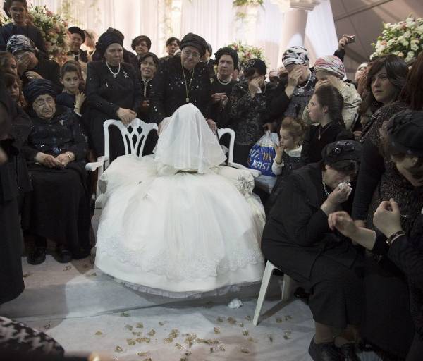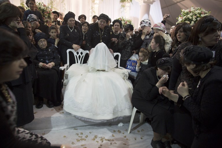 Esta foto de archivo tomada el 02 enero, 2013 muestra a una novia judía rodeada de familiares durante su boda con el bisnieto del rabino de la comunidad jasídica Tzanz ultra-ortodoxa en Netanya. Foto: AFP