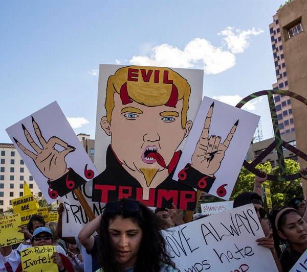 La retórica que el magnate utiliza en sus discursos, percibida como antiinmigrante e incluso racista entre algunos sectores de la sociedad estadounidense, ha hecho que las protestas frente a sus mítines sean habituales, hasta el extremo de que se vio obligado a cancelar un discurso en Chicago en marzo por episodios de violencia entre los manifestantes y sus seguidores.