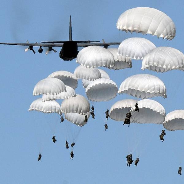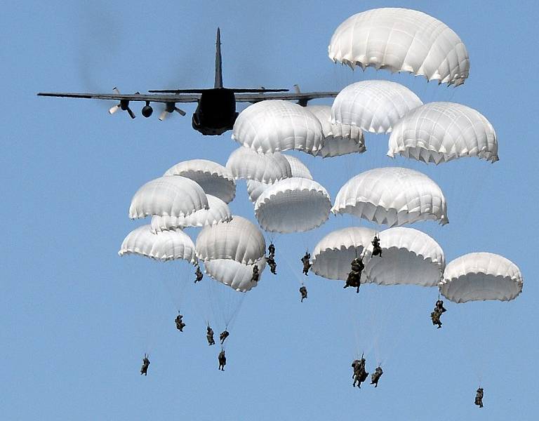 Militares polacos se lanzan en paracaídas hacia complejo militar cerca de Torun, Polonia. Foto: AFP