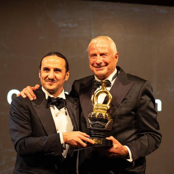 El VI marqués de Lises, Luis Felipe Fernández-Salvador y Campodónico, entrega el galardón TEON al presidente de Barnes International,Thibault de Saint Vincent, en la gala celebrada en el Emirates Palace, con presencia de casas reales, jefes de Estado, representantes de fondos soberanos y empresarios.( )