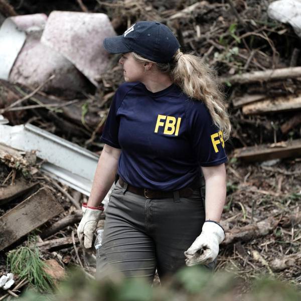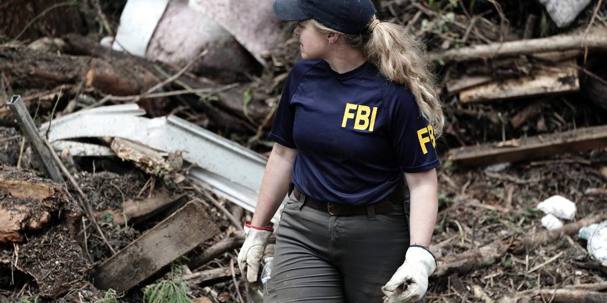 Los agentes de campo del FBI ayudan a buscar en un área, donde un perro de rescate y búsqueda K9 detectó un lugar a lo largo del río Guadalupe cerca del Blue Oak RV Park en Ingram, Texas, EE. UU.( )