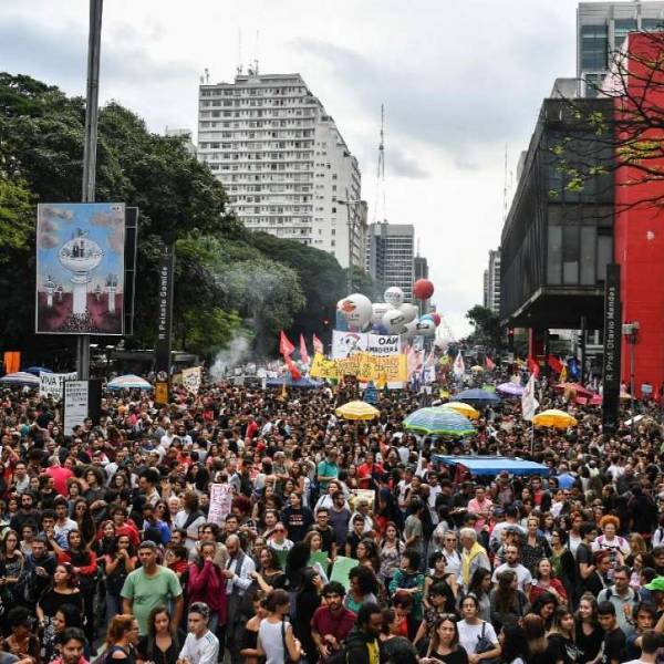 Decenas de miles de estudiantes y profesores de todo Brasil protestaron el miércoles 15 de mayo de 2019 contra los bloqueos de recursos para la educación anunciados por el gobierno de Jair Bolsonaro, que atribuyó la agitación a la manipulación de "idiotas útiles" por activistas de izquierda.