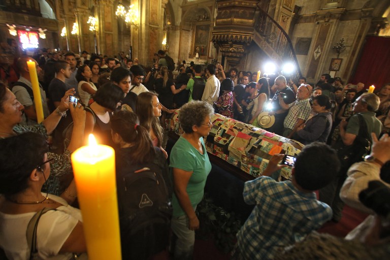 Uno de los temas más famosos de su hermana, "Gracias a la vida", sonaba este miércoles en la Catedral, penúltima morada del escritor que será enterrado el jueves -al igual que Neruda- junto al mar, en una localidad de la región de Valparaíso.