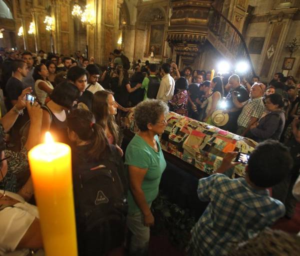 Afuera de la Catedral, ubicada en la popular Plaza de Armas de Santiago, cientos de personas de todas las edades, algunas con libros y flores en sus manos, hacían fila para ingresar al templo a despedir al poeta.