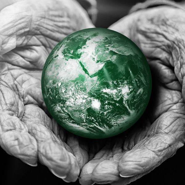 Manos de una persona adulta sosteniendo el planeta tierra( )