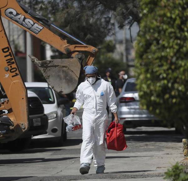 Un investigador forense carga equipo el jueves 20 de mayo de 2021 afuera de una vivienda donde la policía encontró unos fragmentos óseos en el municipio de Atizapán, en el Estado de México.( )