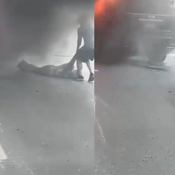 Videos difundidos en redes sociales muestran el momento posterior al ataque, cuando aparece un hombre con camisa blanca cerca del vehículo en llamas, y en otro se ve un cuerpo tirado detrás de la camioneta, en medio de una escena caótica y con tráfico activo.