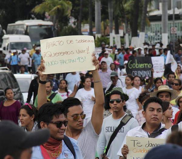 Unos 250 alumnos de escuelas normales (para maestros) e integrantes de la Coordinadora Estatal de Trabajadores de la Educación de Guerrero (CETEG), así como campesinos, se sumaron a los familiares en su recorrido por la Costera Miguel Alemán, la principal avenida de la ciudad.