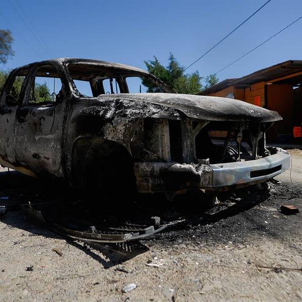 Vista de un coche quemado en San Andrés Larraínzar, en el estado de Chiapas (México). Foto: EFE