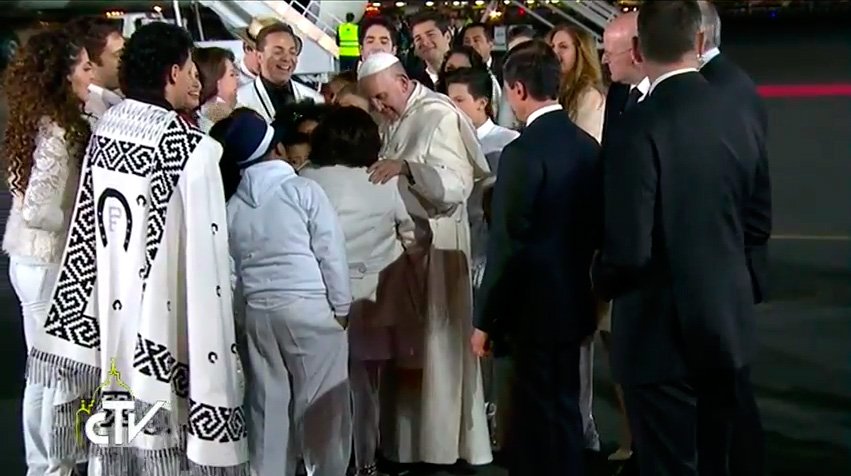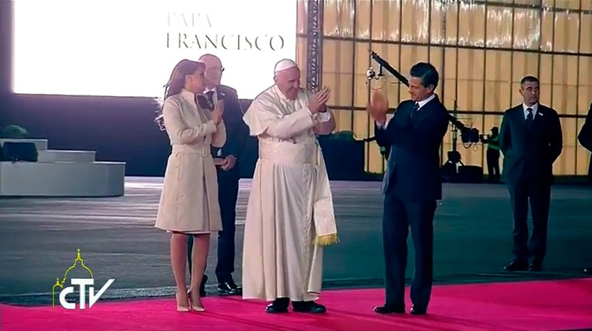 El Papa Francisco arribó al Aeropuerto Internacional de México a las 20h30 (hora de Ecuador) donde fue recibido por una comitiva encabezada por el presidente de ese país, Enrique Peña Nieto, jerarcas de la curia mexicana y un grupo de mariachis.