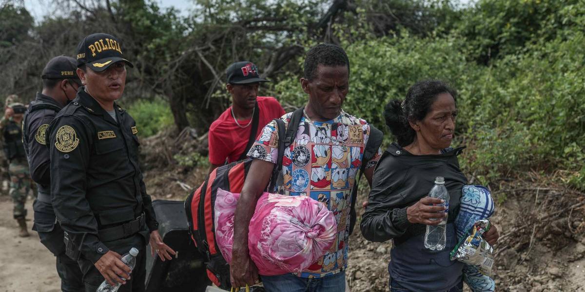 Fotografía de archivo que muestra a miembros de la Policía de Perú mientras controlan el paso de migrantes venezolanos que intentan cruzar la frontera.( )