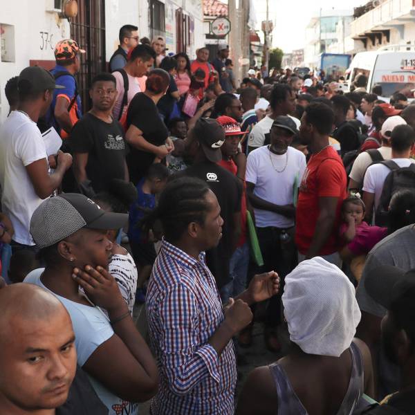 Fotografía de archivo que muestra a migrantes haciendo fila a la espera de resolver su situación migratoria en México. ( )