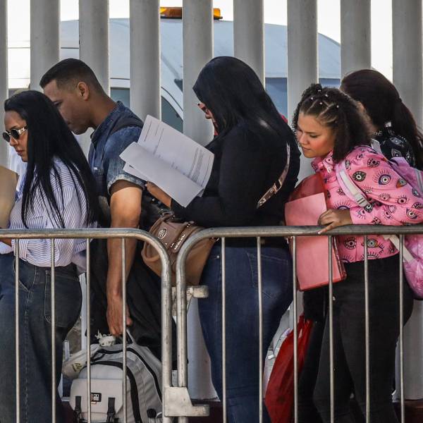 Migrantes hacen fila para solicitar papeles migratorios, este miércoles, en la ciudad de Tijuana, en el estado de Baja California (México).( )