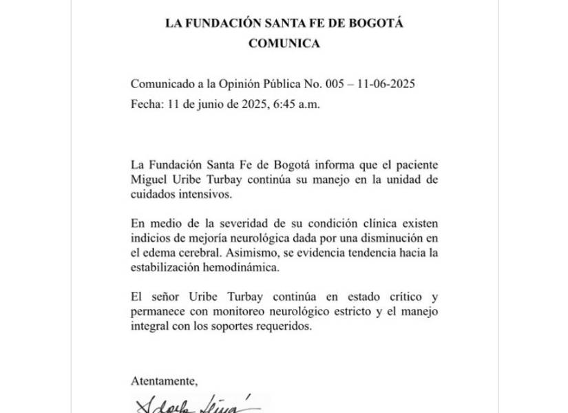 El señor Uribe Turbay continúa en estado crítico y permanece con monitoreo neurológico estricto y el manejo integral con los soportes requeridos, concluye el comunicado de la Fundación Santa Fe, una de las más prestigiosas del país.
