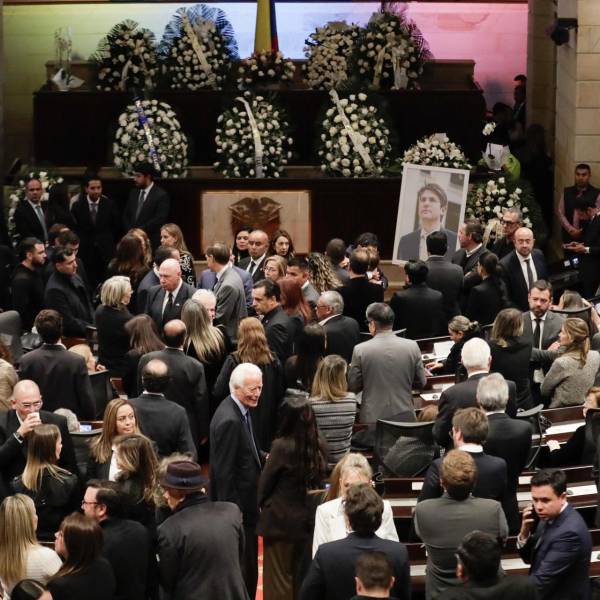 En el salón, lleno de coronas fúnebres y con dos grandes pantallas que muestran el rostro del senador, también están familiares del político, precandidato presidencial del partido de derecha Centro Democrático, entre ellos su esposa, María Claudia Tarazona, quien, al ingresar, se fundió en un abrazo con el padre del líder asesinado, Miguel Uribe Londoño.