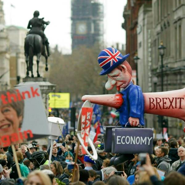 La Marcha Electoral del Pueblo convergió en el Parlamento británico. Los manifestantes portaron banderas de la Unión Europea y carteles elogiando las viejas relaciones entre Gran Bretaña y el continente europeo.