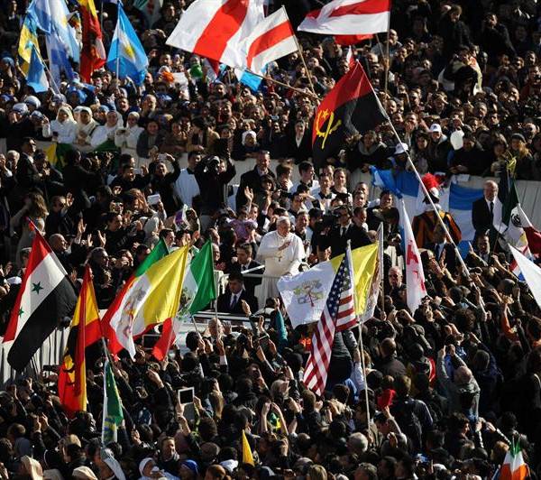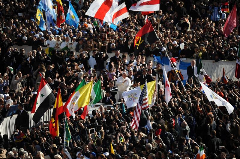 Miles de peregrinos y representantes de más de 130 países de todo el mundo asistieron hoy a la misa de inicio de pontificado de Francisco en una Plaza de San Pedro del Vaticano cuajada de banderas internacionales, principalmente latinoamericanas. Roma, que en estas fechas del año comienza a recibir las primeras oleadas turísticas, ha albergado, con motivo del comienzo del papado de Francisco, a miles de peregrinos -lejos del millón que esperaba el Ayuntamiento de Roma- y a jefes de Estado y delegaciones de todo el mundo.