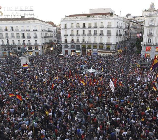 Varios miles de personas se concentraron hoy en la céntrica Puerta del Sol de Madrid a favor de un sistema republicano y para pedir la celebración de un referéndum sobre la continuidad o no de la monarquía en España.