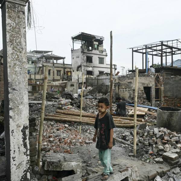 Un niño está de pie entre los escombros de edificios dañados por un incendio en Mandalay el 11 de abril de 2025, tras el devastador terremoto del 28 de marzo.( )