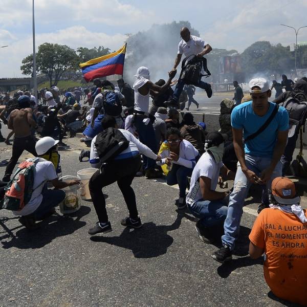 Un vehículo blindado atropelló a un grupo de opositores que manifestaba en Caracas en apoyo a militares sublevados este martes contra el presidente Nicolás Maduro, según imágenes difundidas por medios locales y extranjeros.
