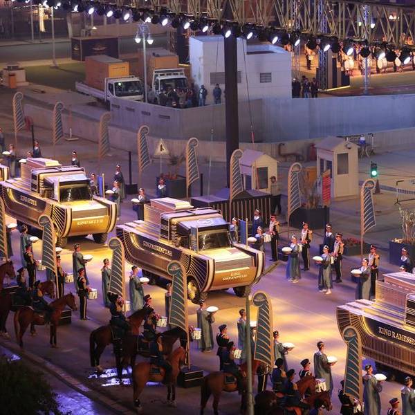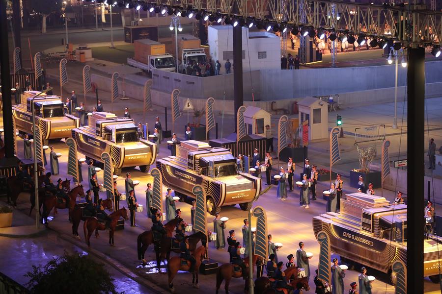 En un espectacular desfile, 22 momias de reyes y reinas del Imperio Nuevo (siglos XVI - XI a.C.) abandonaron este sábado 3 de abril el Museo Egipcio y recorrieron El Cairo a bordo de vehículos blindados con decoración faraónica, acompañados por guardias a caballo y sacerdotes como en la antigüedad.